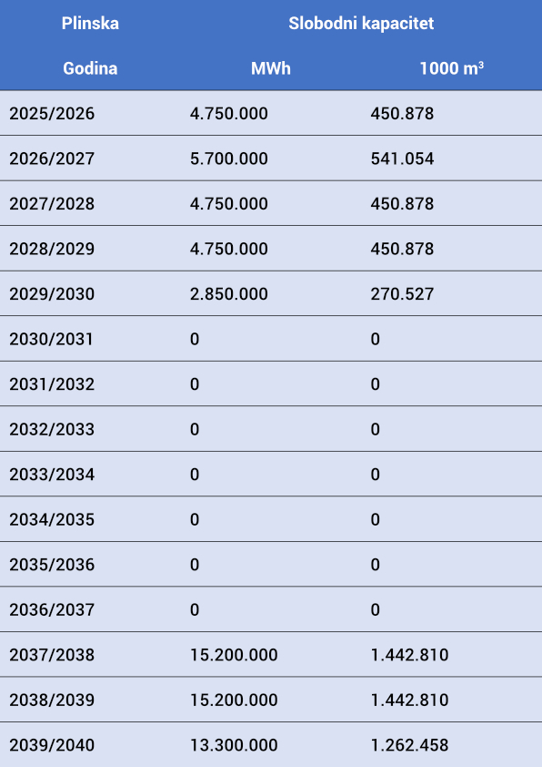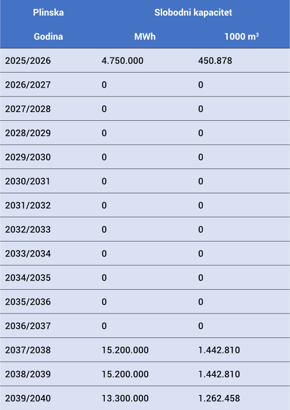 U nastavku je pregled slobodnih kapaciteta terminala po plinskim godinama.