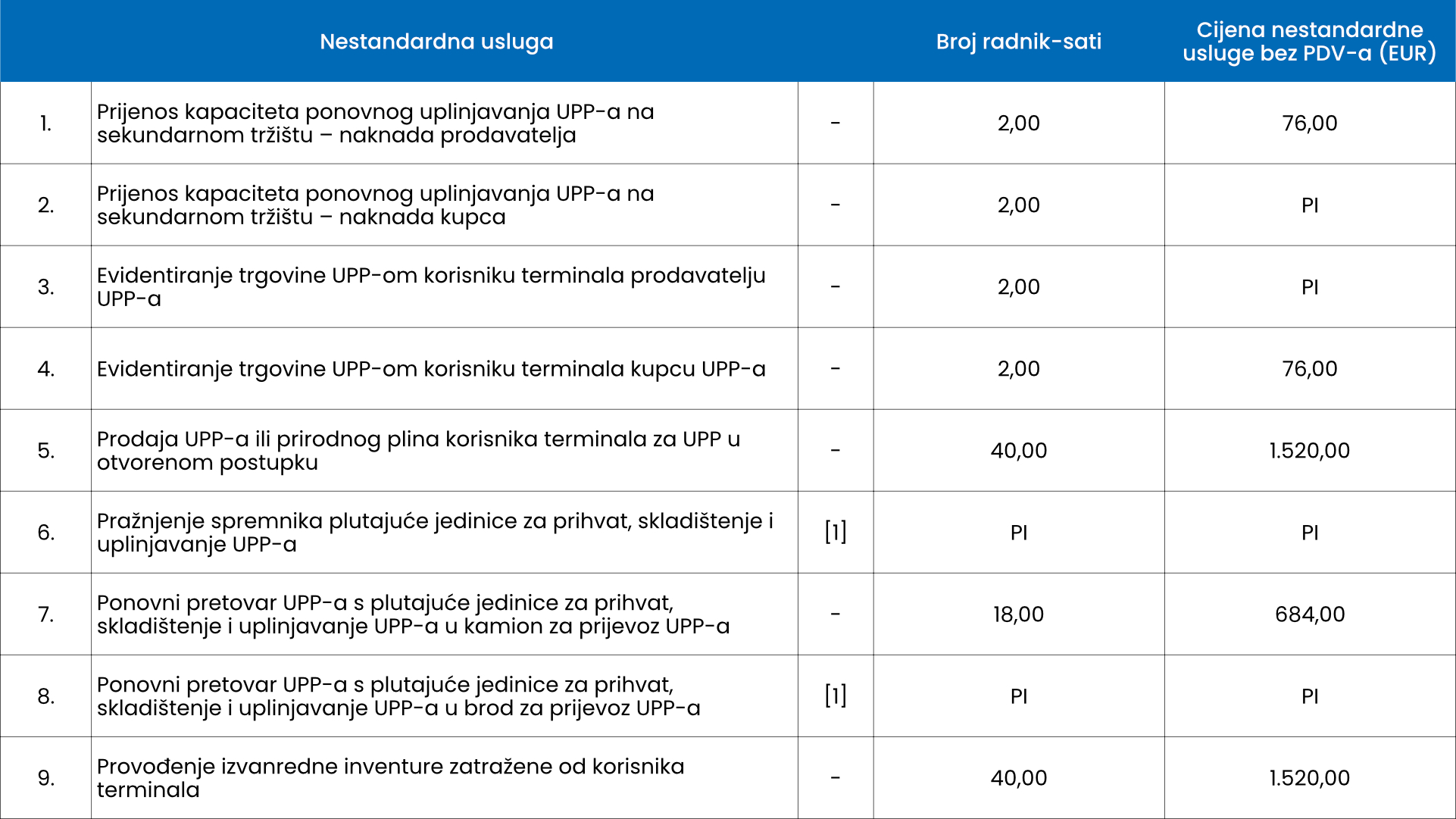 Cijena usluge prihvata i otpreme UPP-a određuje se temeljem tarifnih stavki za uslugu prihvata i otpreme ukapljenog prirodnog plina.